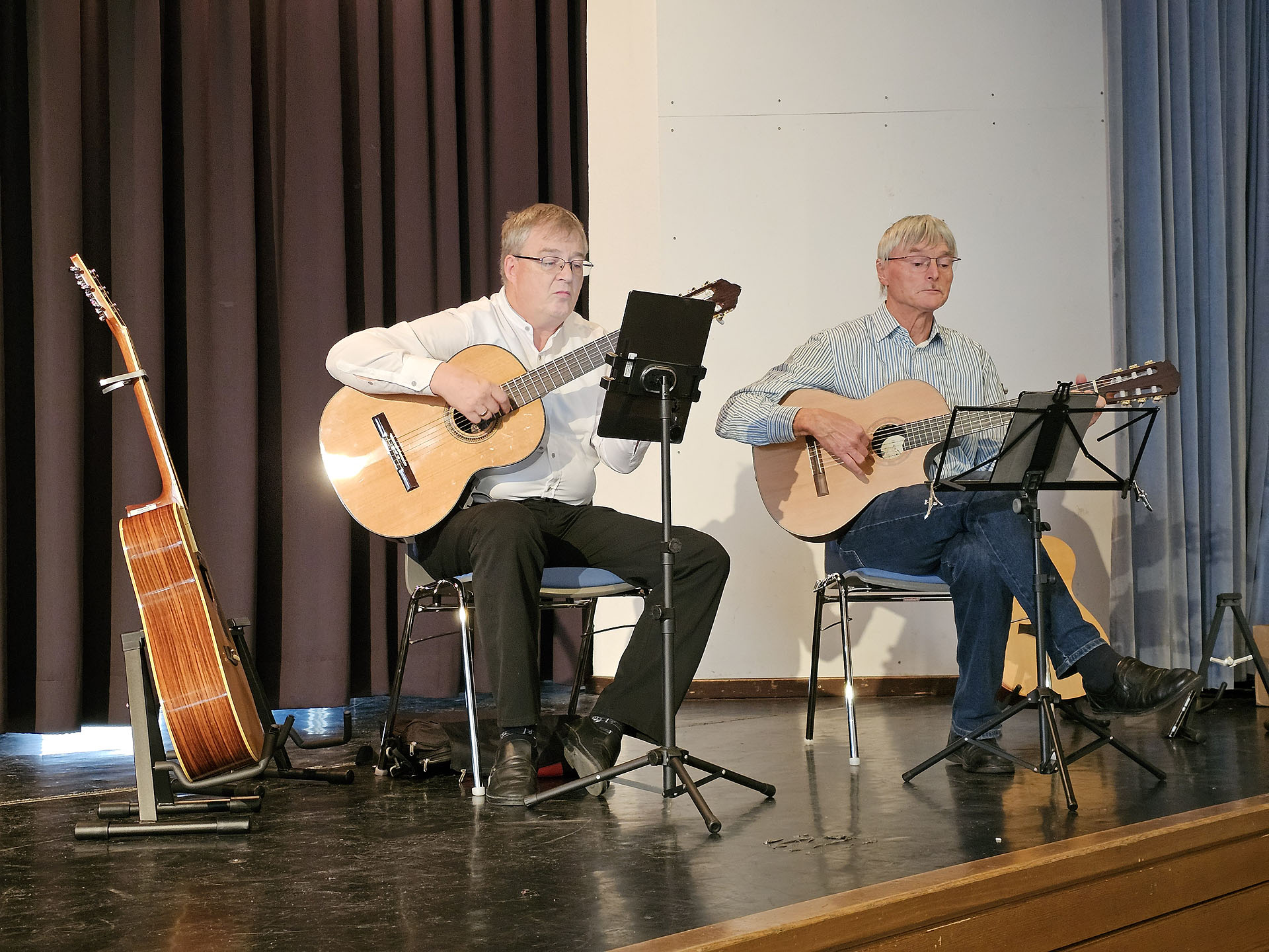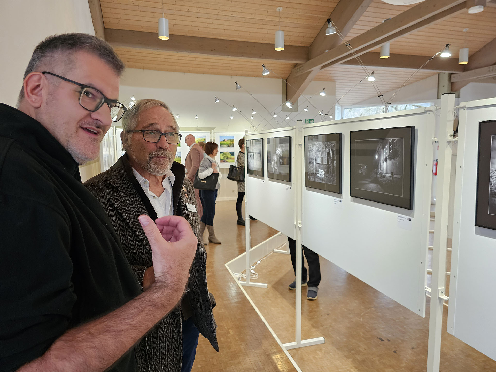 Umrahmt wurde die Vernissage wieder von Bernhard und Harald mit ihren Gitarren. Neben einem eigens für den Fotoclub umgetexteten Lied von Reinhard May durfte auch „Du hast den Farbfilm vergessen“ nicht fehlen.