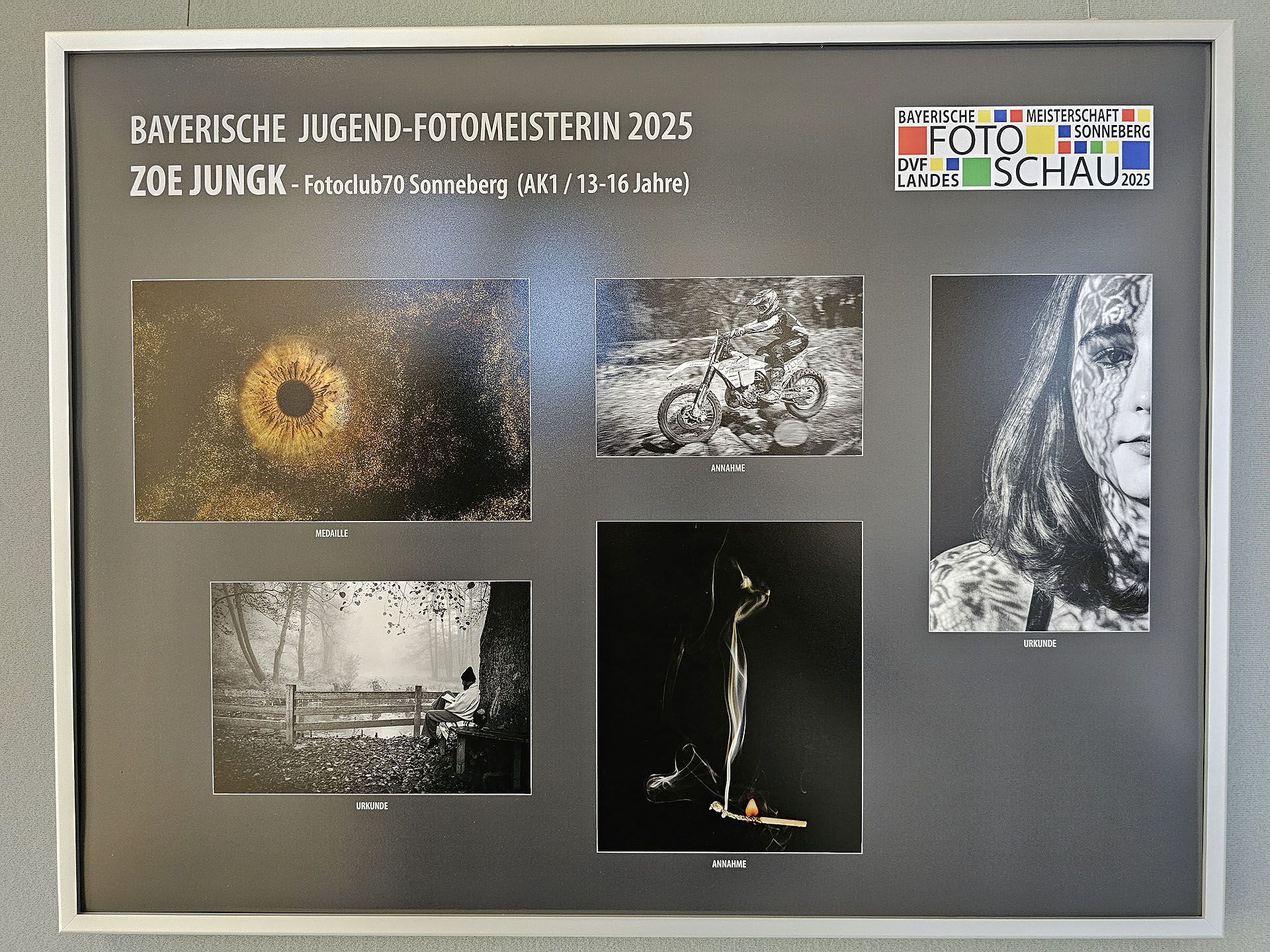 Die Preisverleihung fand bereits am 27. September 2025 in der Stiftung Judenbach statt – mit über 100 anwesenden Teilnehmern, Fotobegeisterten und Interessierten. Der Fotoclub 70 ist besonders stolz auf die Jugendfotomeisterin Zoe Jungk, die den Titel in die eigenen Reihen holen konnte. Schaut vorbei und lasst euch von den eindrucksvollen Bildern begeistern. Noch bis zum 31.10.2025 (jeweils Freitag bis Sonntag von 14 bis 17 Uhr) ist die Stiftung Judenbach geöffnet. Bilder und die Ergebnisse zur Fotomeisterschaft findet ihr beim DVF Bayern und auf der Internetseite des Sonneberger Fotoclubs.