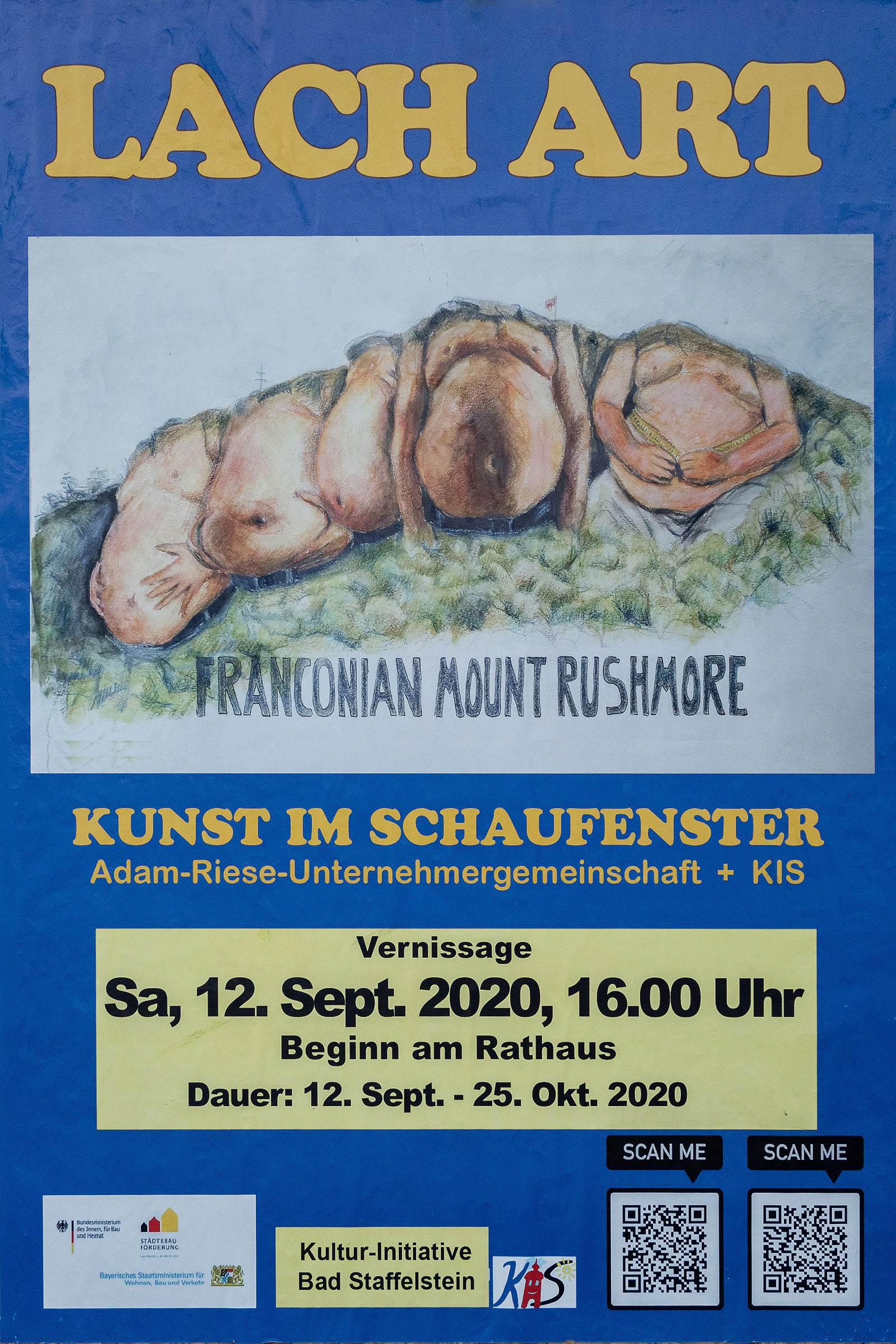 Vergangenen Donnerstag war das Wetter wieder richtig schön und so trafen wir uns am Marktplatz in kleiner Runde und zogen von dort die Bahnhofstraße hinunter. Dabei wandelten wir auf den Spuren von „Lach Art“. Dabei geht es um „Kunst in Schaufenstern“. Genauer um Lach-Art, also „heitere Bilder in schwieriger Zeit“, wie Anton Köcheler von der Kultur Initiative Bad Staffelstein e. V. (KIS) das nennt. Das ganze ist eine Co-Produktion zwischen der Adam-Riese-Unternehmergemeinschaft, Quartiersmanager Michael Böhm und eben der KIS.
